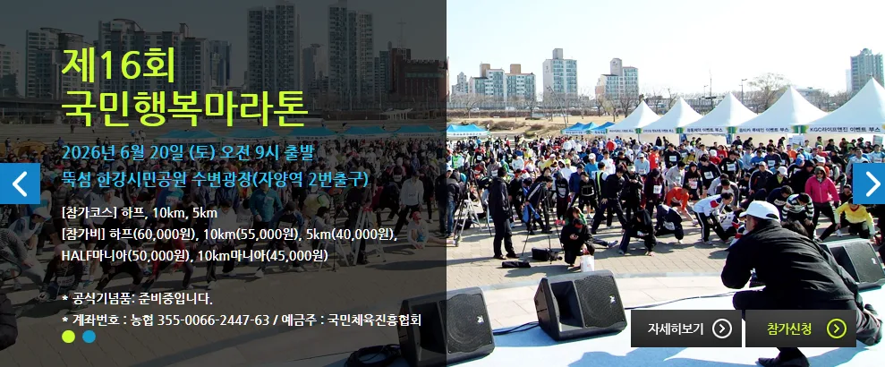 2026년 6월 20일(토) 국민행복마라톤을 서울 뚝섬한강공원 수변광장에서 개최합니다. 동호인 및 달림이 참가자 여러분의 많은 참여와 성원 부탁드립니다.