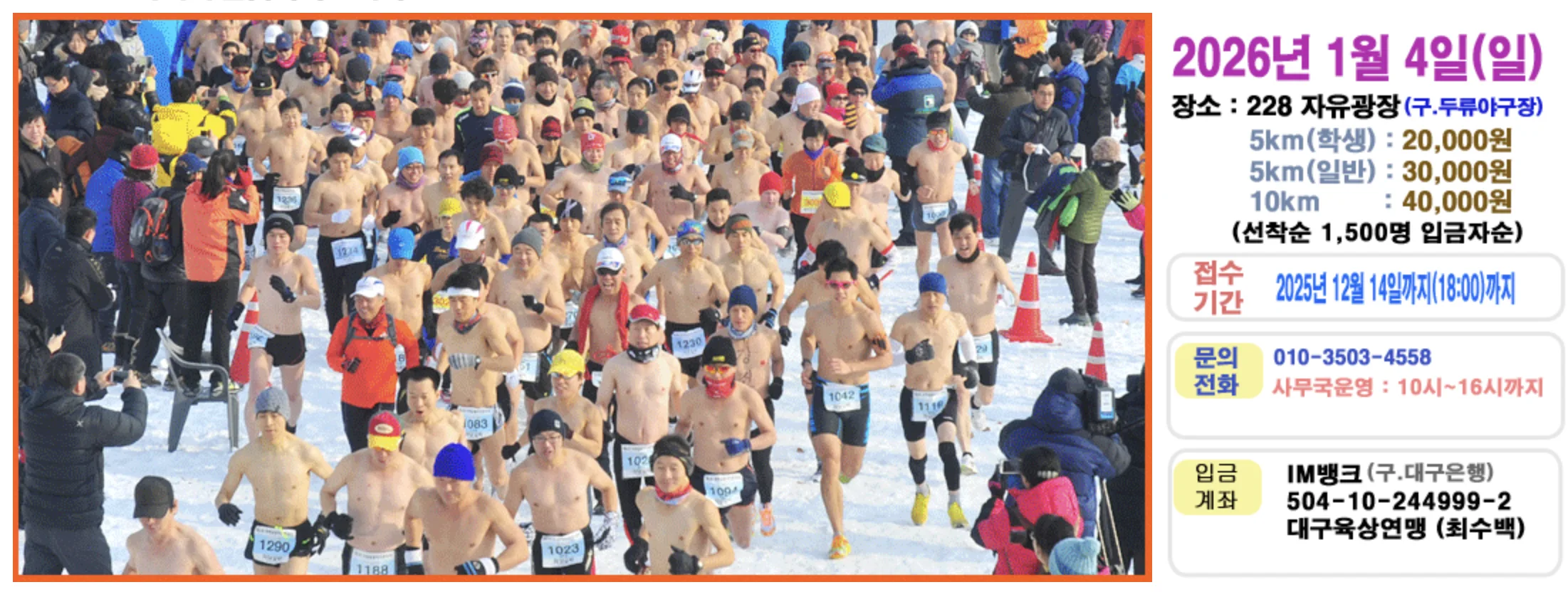 ■ 대 회 부 별 ■ ▶5km학생 남.여부. ▶5km일반 남.여자부 ▶10km 여자부. ▶10km(남)청년부. (남)장년부 (총 7개부분) ○ 신청기간: 2025. 10. 15 ~ 12. 14(2개월) 선착순 1,500명(10km1,000명. 5km400명. 학생부100명) ○ 주 최: 대구광역시육상연맹 ○ 주 관: 대구광역시육상연맹, 대구광역시 구. 군육상연맹 대회코스도 http://r.dgrunner.co.kr/board/1020.asp?SFILENAME=7002&wno=111