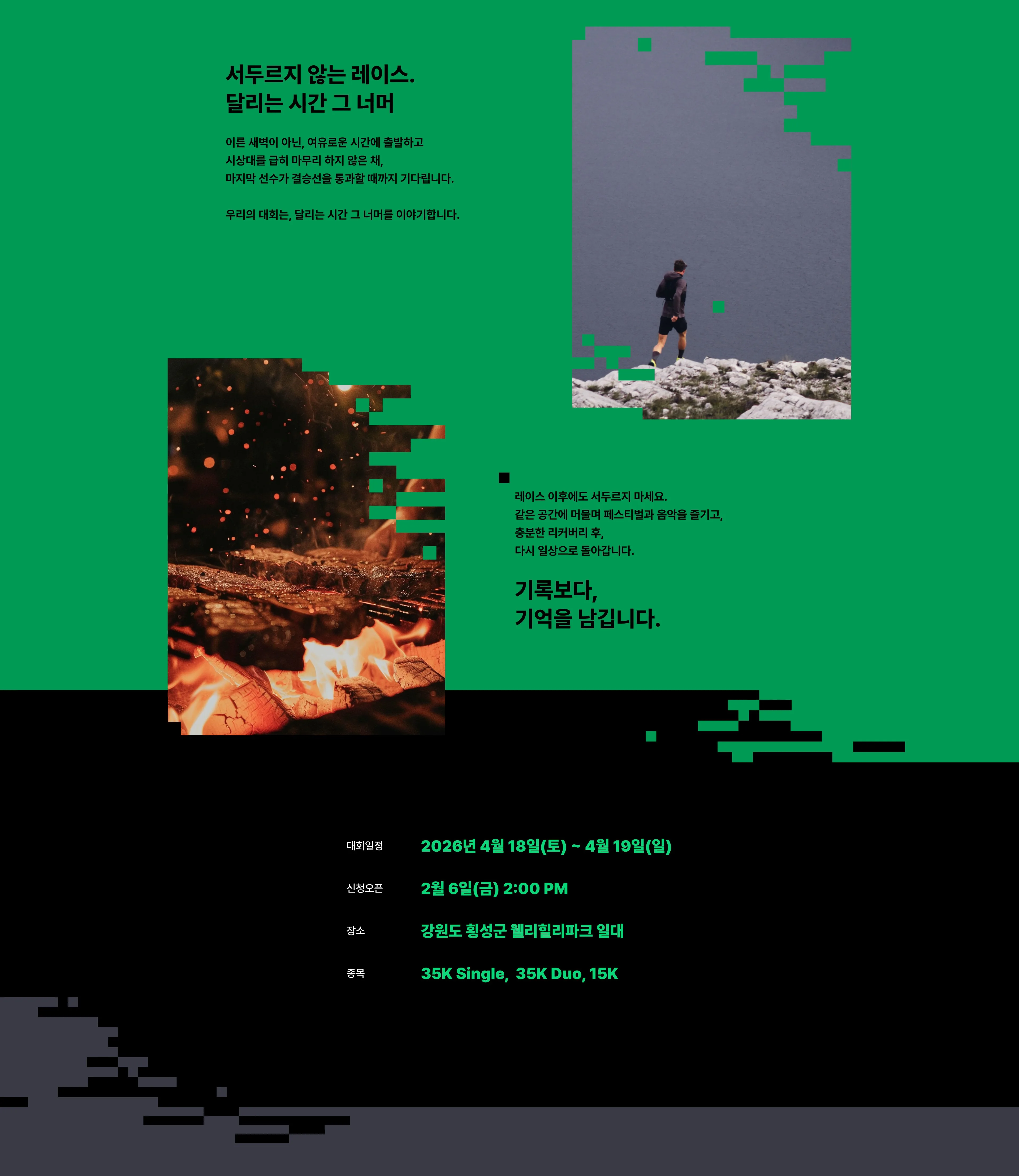 [STAY&PLAY] 서두르지 않는 레이스. 달리는 시간 그 너머 이른 새벽이 아닌, 여유로운 시간에 출발하고 시상대를 급히 마무리 하지 않은 채, 마지막 선수가 결승선을 통과할 때까지 기다립니다. 우리의 대회는, 달리는 시간 그 너머를 이야기합니다. 레이스 이후에도 서두르지 마세요. 같은 공간에 머물며 페스티벌과 음악을 즐기고, 충분한 리커버리 후, 다시 일상으로 돌아갑니다. 기록보다, 기억을 남깁니다.