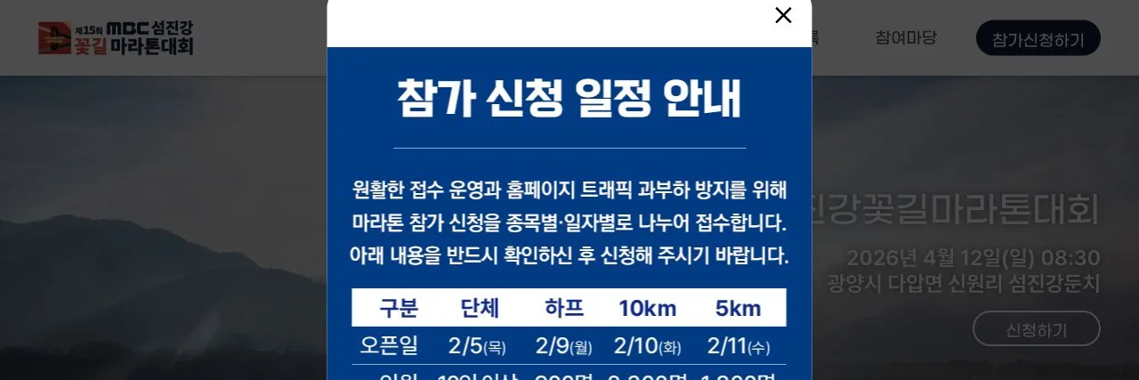 종목별 순차 접수진행 / 2월 5일(단체) / 2월 9일(하프) / 2월 10일(10km) / 2월 11일(5km) / 조기마감될 수 있습니다.