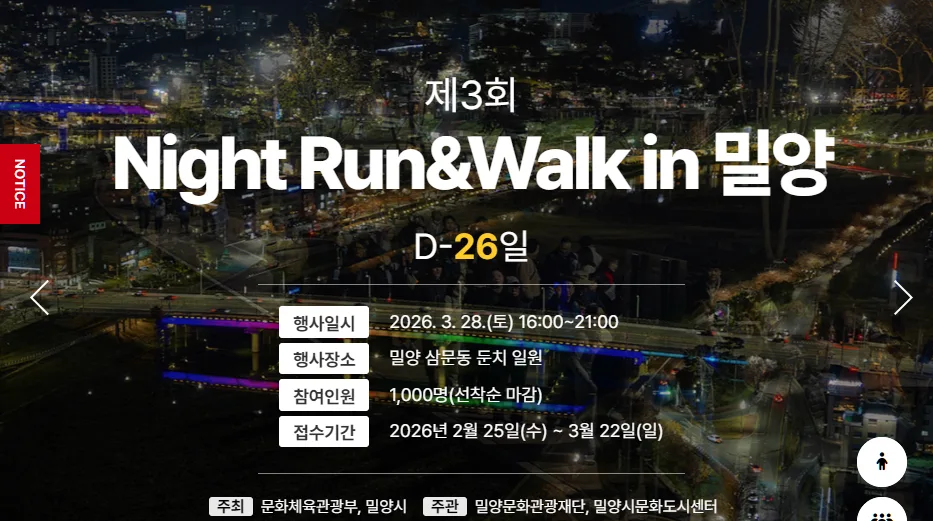 벚꽃빛 강변에 펼쳐지는 Hot한 밤의 질주! '제3회 Night Run&Walk in 밀양은 봄밤 밀양강변을 따라 달리고 걷는 5km 야간 러닝 페스티벌입니다. 기록에 도전하는 러너는 선두 출발 후 논스톱으로 완주 가능하며, 체험형 참가자는 코스 곳곳에 준비된 '매운맛' 시식과 함께 자유롭게 걷고 달릴 수 있습니다. 벚꽃야경, 강변코스, 그리고 밀양만의 Hot한 매력까지 기록과 음식을 동시에 즐길 수 있는 이색 나이트 이벤트 봄밤 가장 뜨거운 5km를 경험해보세요. 진행일시: 2026. 3. 28.(토) 16:00~ 진행장소: 밀양시 삼문동 밀양강둔치 일원 모집기간: 2026. 2. 25.(수)~3. 22.(일) 운영코스: 5km 참가비: 20,000원 (참가 신청 후 현장 등록 시 밀양사랑상품권 10,000원 페이백) 문의: 밀양문화관광재단 관광팀 055-359-4582